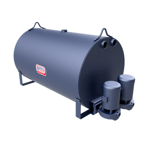 A small Economical Make-up Horizontal boiler feed unit with regenerative Turbine pumps. Designed for low flow rates (up to 30 GPM) and moderate to high (up to 700 feet of head) discharge pressure applications. A 3/16" thick, black steel receiver provided with corrosion resistance coating provided for years of service. Unit is floor-mounted, horizontal style allowing for low inlet returns; numerous size receivers are available. A mechanical make-up water valve is standard with stainless steel float and rubber fitted sealing face. Unit built in either simplex or duplex configurations with 3500 RPM, single-phase motors that provide low inertia for intermittent operation. Two pump openings provided on all units.